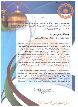 مدیر کل بهزیستی استان خراسان رضوی از تلاشهای معاون درمان دانشگاه قدردانی نمود .