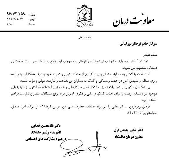 خانم فرحناز پورکیانی با تایید معاون درمان و قائم مقام رئیس دانشگاه در امور مشارکتهای اجتماعی سرپرست مددکاری دانشگاه منصوب شد .