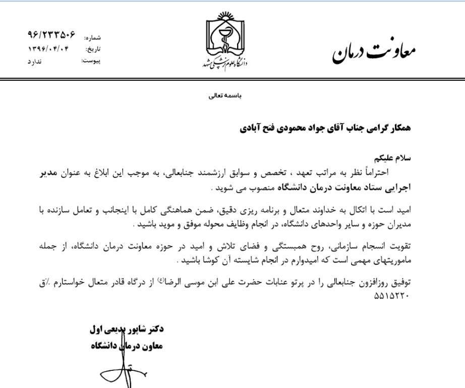 معاون درمان دانشگاه مدیر اجرایی ستاد معاونت درمان را منصوب کرد . دکتر بدیعی طی ابلاغی آقای جواد محمودی را به سمت مدیر اجرایی معاونت درمان منصوب نمود .