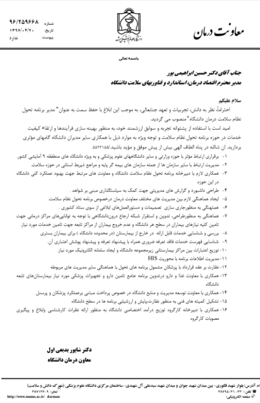 امید است با استفاده از پشتوانه تجربه و سوابق ارزشمند خود، به منظور بهینه سازی فرآیندها و ارتقاء کیفیت خدمات در حوزه برنامه تحول نظام سلامت و توجه ویژه به موارد ذیل با همکاری سایر مدیران دانشگاه گامهای مؤثری بردارید. ان شالله در پناه الطاف الهی بیش از پیش موفق و مؤید باشید