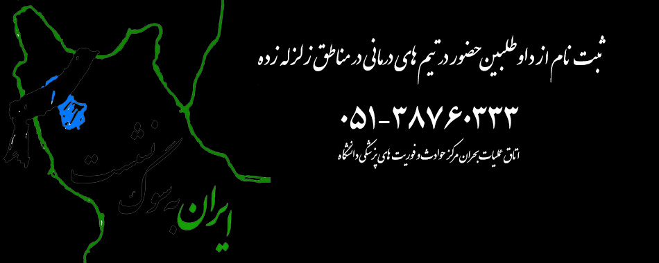 ضمن عرض تسلیت به مناسبت درگذشت دلخراش جمعی از هم میهنان گرامی در اثر سانحه اسفناک زلزله در استانهای غربی کشور، به استحضار می رساند تمامی اساتید محترم هیات علمی، کارکنان گرامی و دانشجویان عزیز دانشگاه علوم پزشکی مشهد که داوطلب حضور در تیم های درمانی در مناطق زلزله زده می باشند، جهت هماهنگی و اعلام حضور می توانند مشخصات خود را از طریق شماره تماس38760333-051