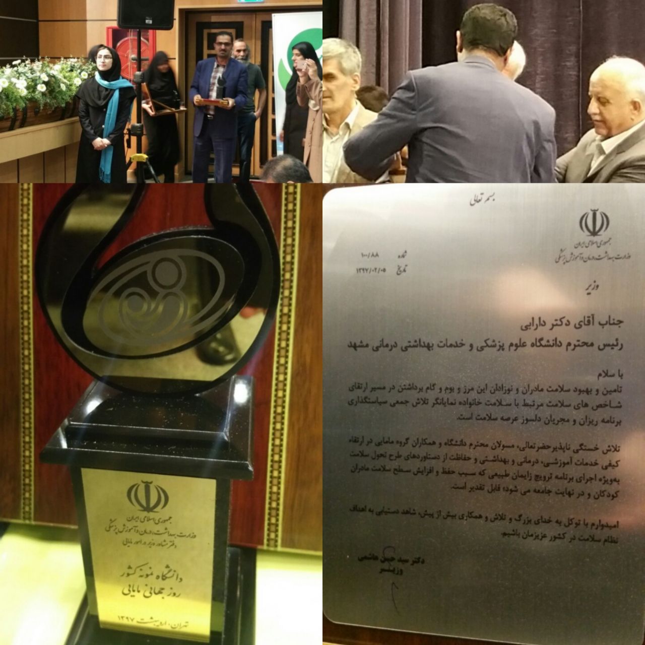 وزیر بهداشت، درمان و آموزش پزشکی با اهدای تندیس و لوح سپاسی به رئیس دانشگاه علوم پزشکی مشهد، تلاش های این دانشگاه در ارتقای کیفی خدمات آموزشی، درمانی و بهداشتی و حفاظت از دستاوردهای طرح تحول سلامت را مورد تقدیر قرار داد.