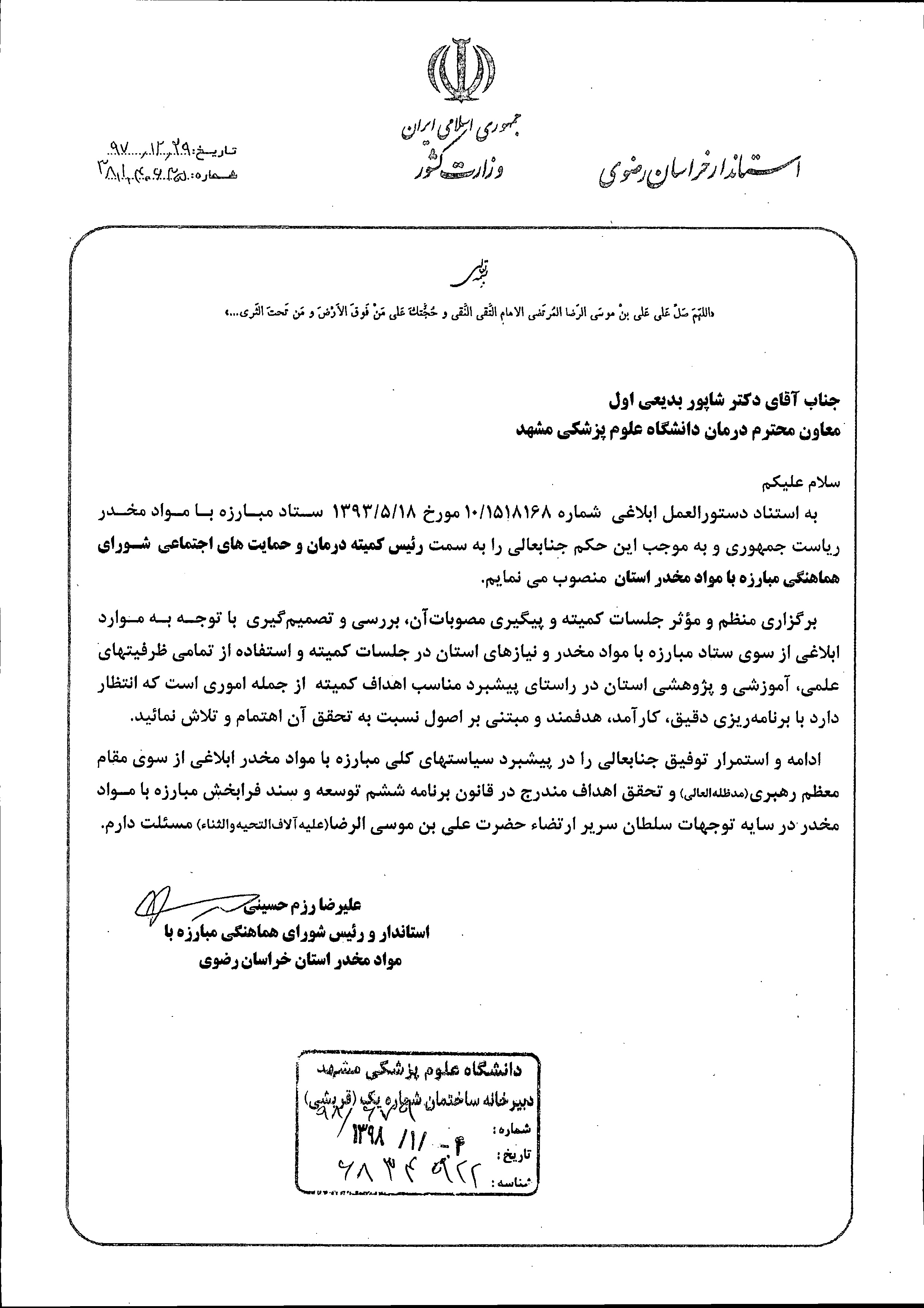 استاندار خراسان رضوی در حکمی معاون درمان دانشگاه علوم پزشکی مشهد را به عنوان رییس کمیته درمان و حمایت های اجتماعی شورای هماهنگی مبارزه با مواد مخدراستان منصوب کرد.