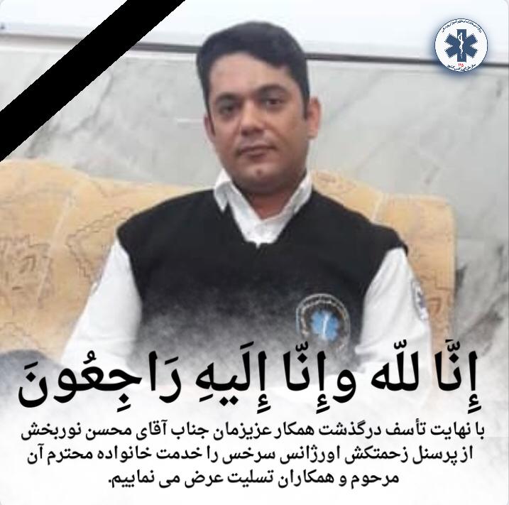 با قلبی آکنده از غم و اندوه سوگوار درگذشت همکار صدیق و خدوم اورژانس پیش بیمارستانی شهرستان سرخس که سالیان متمادی را در راه خدمت به هم وطنان خود گذرانده و بر اثرحمله قلبی دار فانی را وداع گفته و جان به جان آفرین تسلیم نموده است هستیم . اوکه در یکسال اخیر و در مواجهه با بیماری کرونا تلاشهای گسترده ای را برای حفاظت از سلامت آحاد جامعه انجام داده بود با کوله باری از توشه های ارزشمند حاصل از دعای خدمات گیرندگان به پیشگاه خداوند شتافت و رفقا و همکاران خود را در عزای خود نشاند . اینجانب این مصیبت جانکاه را به تمامی کادر درمان استان تسلیت عرض نموده برای آن سرباز خدوم عرصه سلامت آرزوی غفران و رحمت الهی و برای سایرین خواستار عاقبت بخیری و پایمردی بر تداوم خدمت به مردم شریف کشورمان هستم